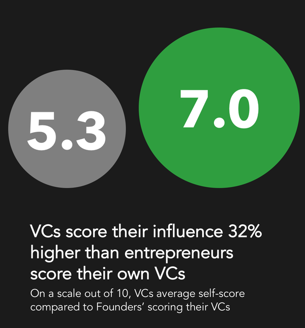 One of the starkest contrasts is the way each group scored how impactful and helpful the VC has been for portfolio companies on a scale of one to ten. On a scale of 1 to 10, the average VC scored themselves a 7 while founders perceived them as a 5.3 — a 32% difference.