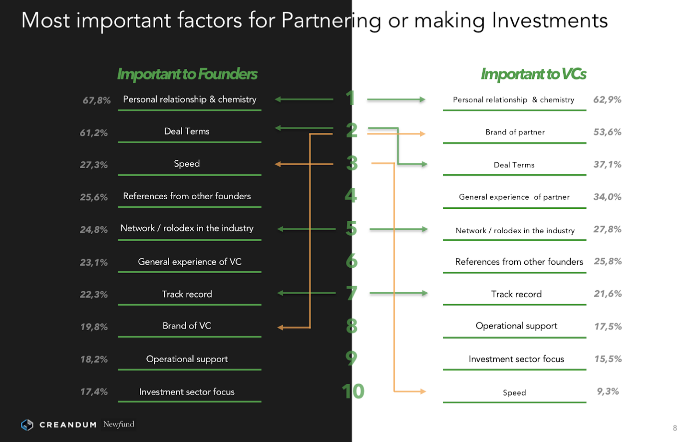 The survey also detailed the most telling aspects of how partnership decisions between VCs and founders are made. Founders ranked their top three most important criteria for choosing to partner with a VC, and VCs ranked top 3 criteria they thought the founders evaluated them on.