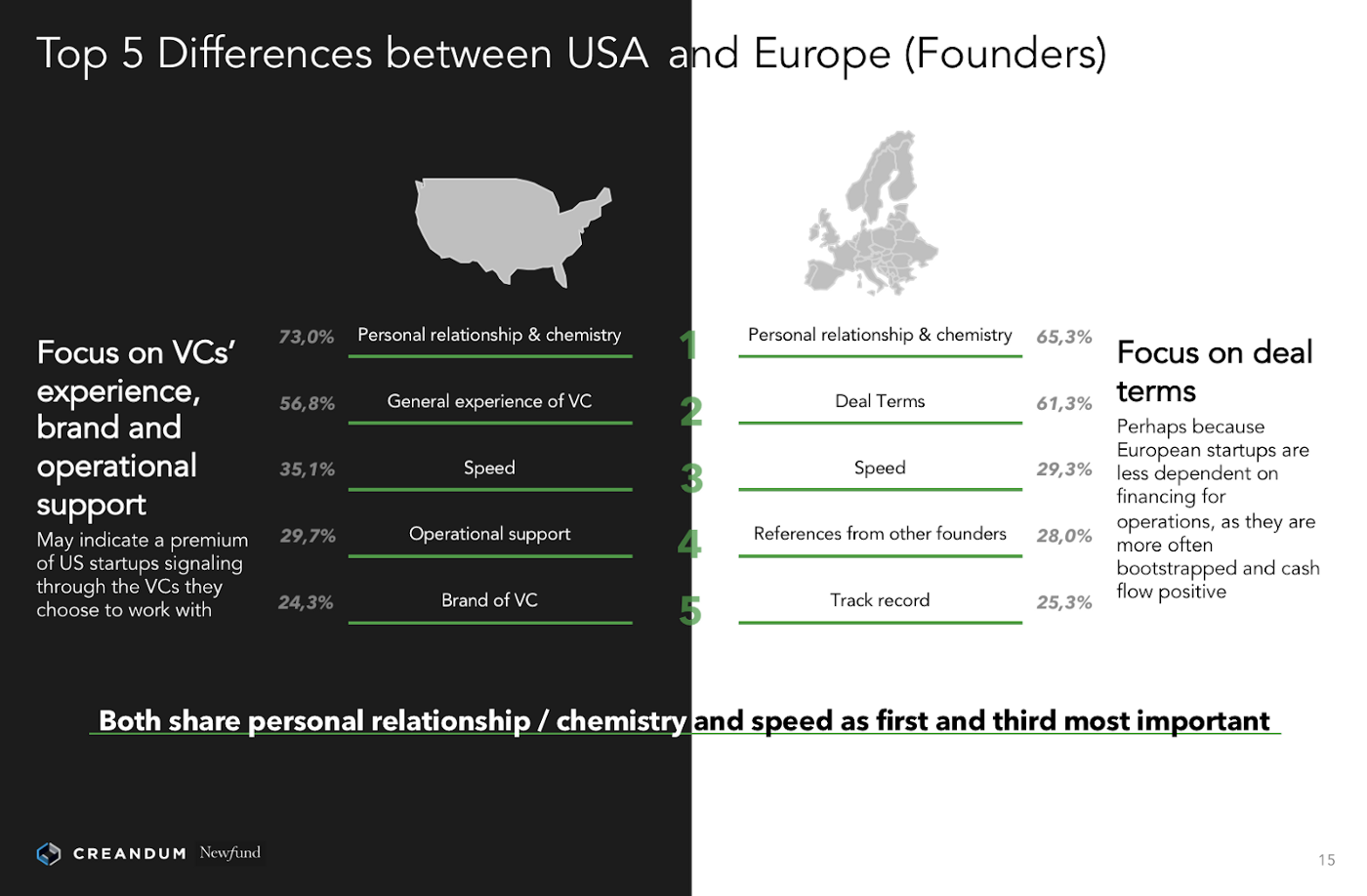 Specific perspectives also differed across geographies. Founders in both Europe and the US share personal relationship & chemistry and speed as first and third most important characteristic when deciding to work with a VC.