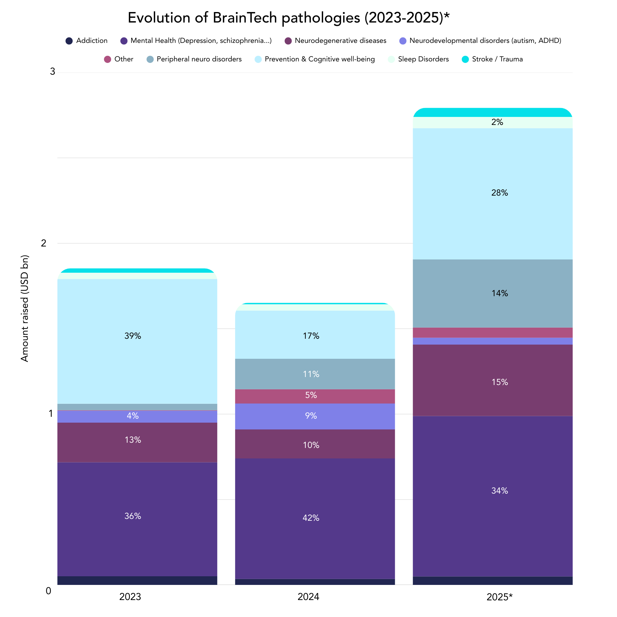 Prevention and cognitive well-being show a strong rise across the period, with total funding reaching approximately $1.8 billion. The shift becomes particularly clear in 2025, as more capital flows into solutions focused on early intervention, cognitive support and long-term brain-health monitoring.