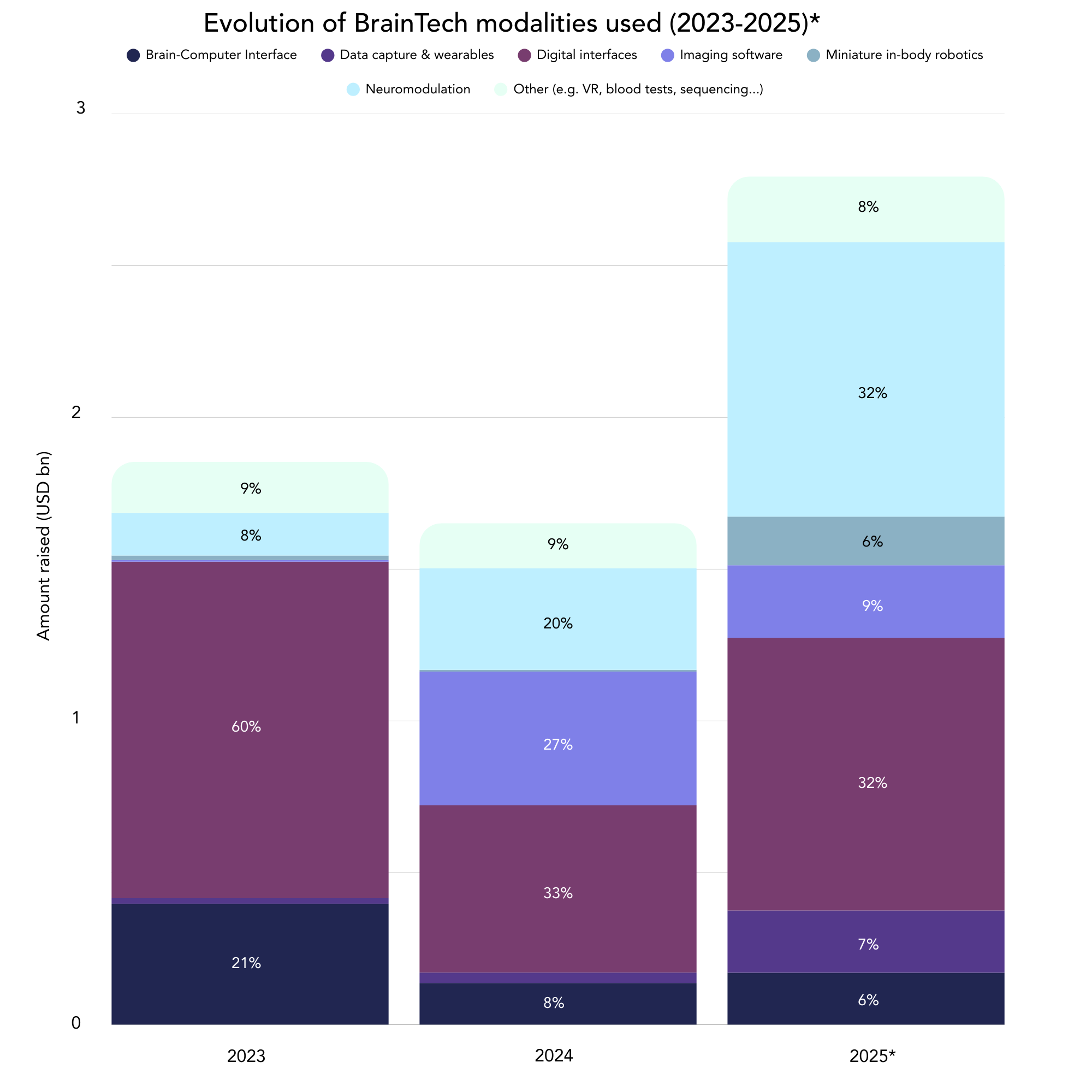 Digital interfaces remain the dominant modalities across Braintech, especially in mental health, where around 80% of solutions rely on app- or web-based interfaces. Over the 2023-2025 period, they represent approximately $2.6 billion in funding. In practice, these solutions are mostly B2C platforms focused on matching users with clinicians, providing coaching or structured follow-up, and building support communities.