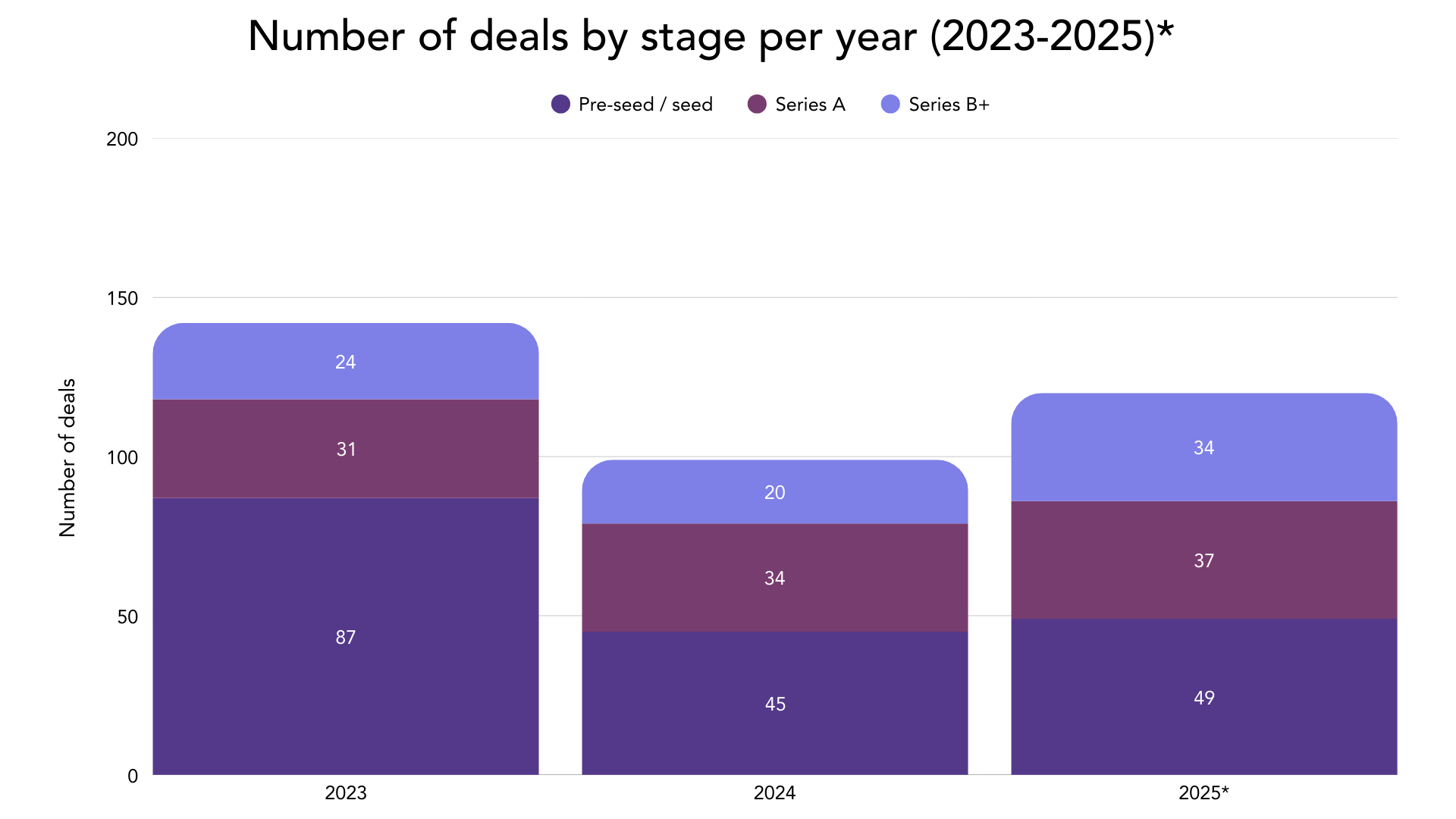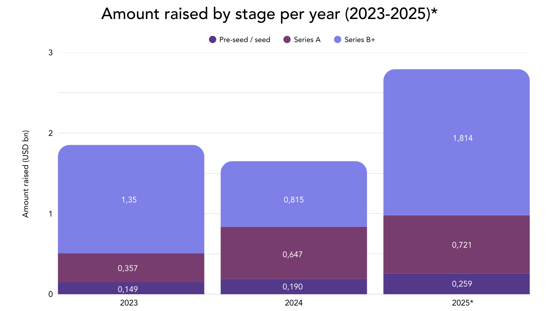 - Maturity: In number of deals, the market remains heavily early-stage (Pre-seed / Seed / Series A). In capital, however, Series B+ now capture the majority of funding and accelerate strongly in 2025. This reflects a sector that is maturing, with capital increasingly flowing to more established players and larger tickets.