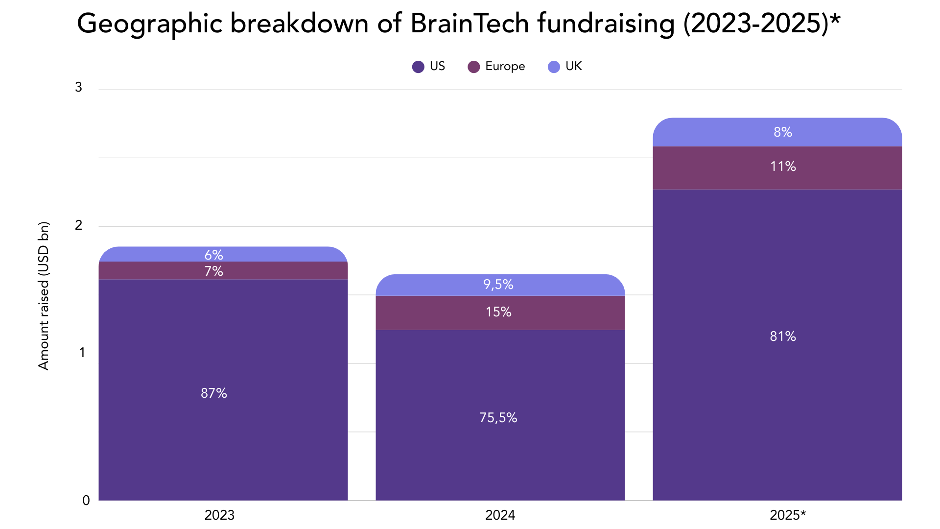 The United States remains the clear center of gravity for Braintech, with investors increasingly concentrating capital there. Over the 2023–2025 period, total disclosed funding reached approximately $6.3 billion, of which the US alone accounts for about $5.1 billion. This dominance reinforces the relevance of a US-oriented strategy for European companies seeking scale.