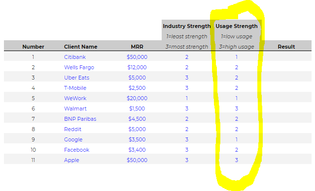 The first step is rating each client (or the top 30 if you got many) from 1 (low) to 3 (high) in these two categories : 1) strength of industry and 2) strength of usage. The multiplication of the two ratings gives us a score between 1 and 9.