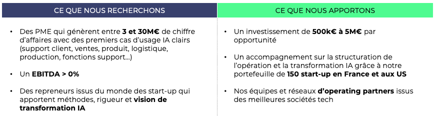 Nous avons l’intime conviction qu’une nouvelle génération d’entrepreneurs est en train d’émerger : ancrés dans le réel, qui allient ambition et pragmatisme et qui voient dans l’IA un levier de modernisation et de croissance de belles PME prêtes à être transformées.