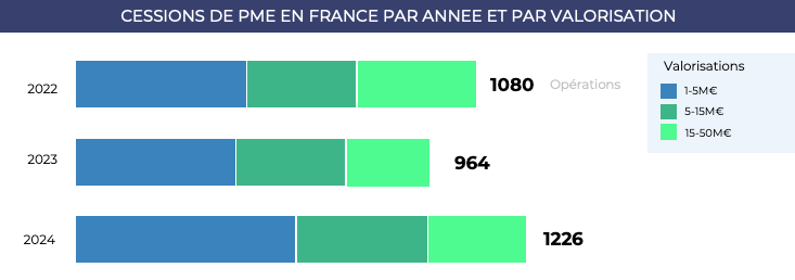 - Env. 950 transactions en 2024 dans la tranche 1-15M€ de valorisation dont env. 350 dans la tranche 5-15M€ (+17% vs 2023) et env. 600 dans la tranche 1-5M€ (+ 39% vs 2023)