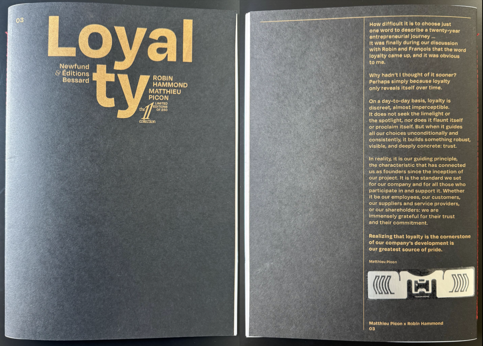 Loyalty is available in a limited edition. Printed in risography by Éditions Bessard, each book features an integrated Tageos RFID chip: a unique digital signature serving as technological proof of trust and authenticity.